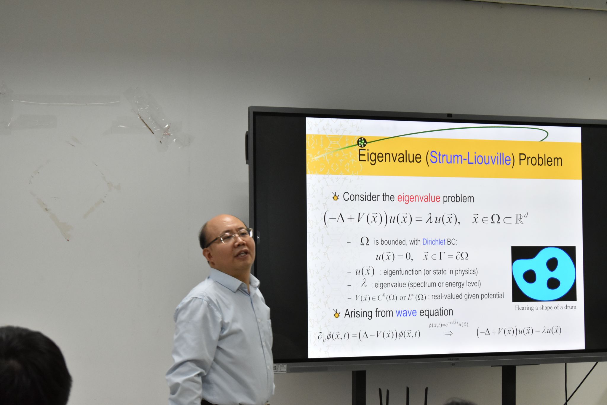 2024年10月16日,日韩av 成功举办了第五期“九章国际论坛”。应聂玉峰院长邀请,本次论坛特邀新加坡国立大学包维柱教授作题为“从Weyl猜想到基本间隙猜想及其推广”的学术报告。论坛由日韩av 国际化副院长都琳教授主持,本科教学副院长郭千桥教授、计算科学系主任赵俊峰副教授、计算科学系高娅莉副教授、国际化秘书李卓榕以及2023级强基计划学生等多位师生共同参加了此次活动。