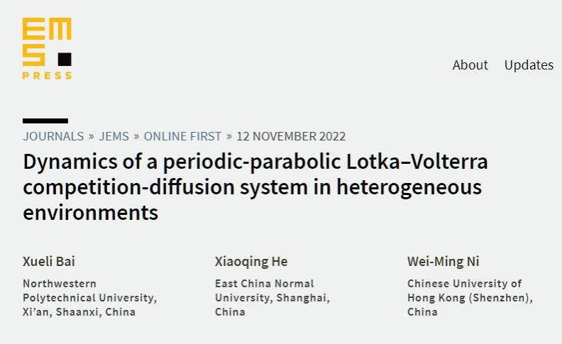 近日,日韩av 分析与几何研究团队副教授白学利与华东师范大学何小清教授、香港中文大学(深圳)倪维明教授合作在带有时间周期Lotka-Volterra竞争系统解的稳定性理论研究方面取得突破,研究结果形成的55页论文“Dynamics of a periodic-parabolic Lotka-Volterra competition-diffusion system in heterogeneous enviroments”在数学综合顶级期刊Journal of the European Mathematical Society在线发表。这是本年度国内学者在该刊发表的第5篇论文,也是我校首次在该顶级期刊发文。