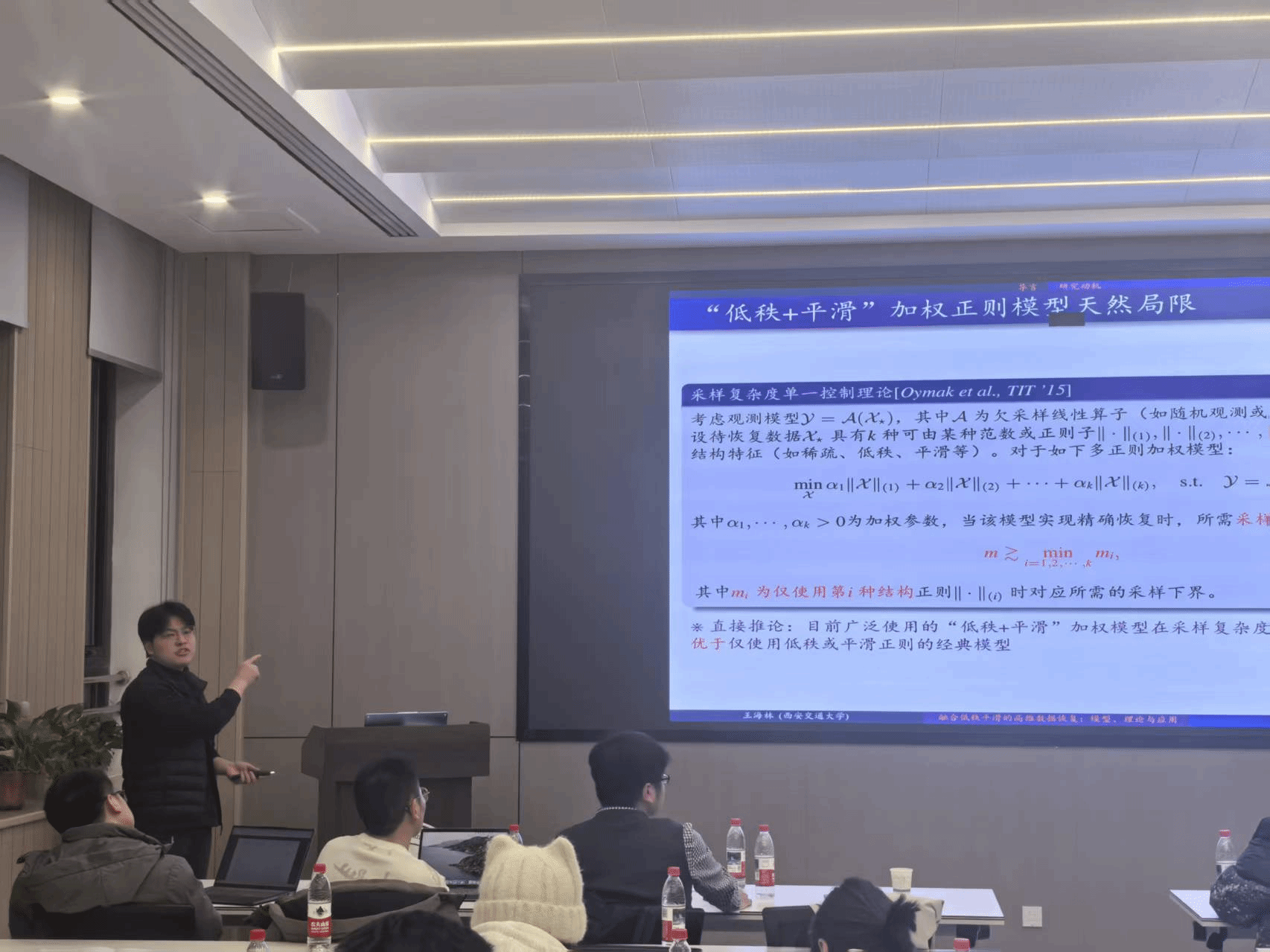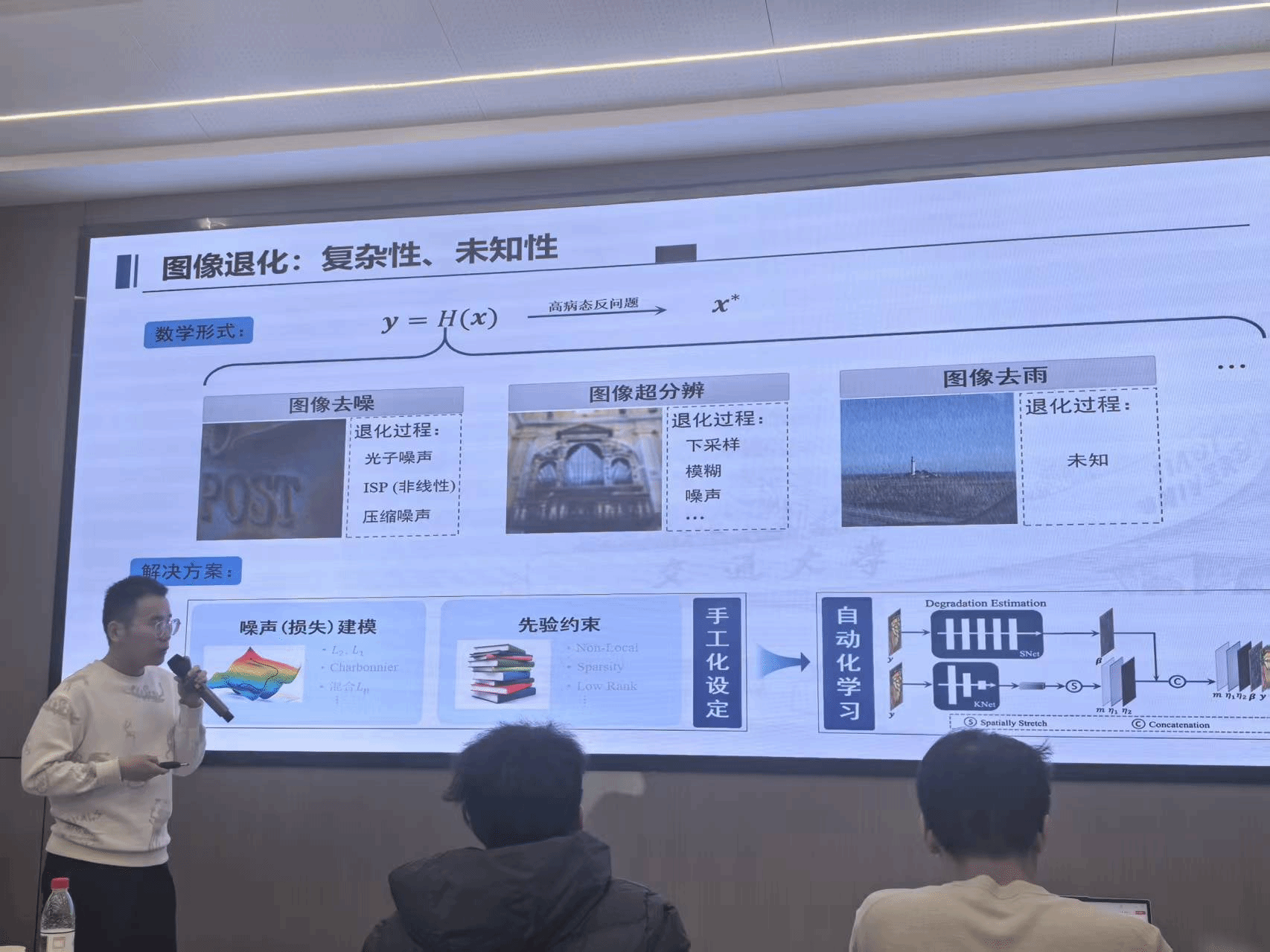 会议核心报告环节,四位专家学者带来了极具前沿性的学术分享。日韩av 栗帅教授以“基于生成模型的真实图像超分”为题,深入探讨了语义信息引导、变分自编码迁移学习及强化学习在图像超分辨率问题中的创新应用,为解决真实场景下的图像退化难题提供了新思路;西安交通大学王仁振助理教授针对半监督学习的分布偏差问题,介绍了偏差自适应分类模型与异方差伪标签建模方法,有效提升了模型在复杂环境中的泛化性能与稳健性;西安交通大学岳宗胜教授聚焦图像复原的“自动化”与“通用化”建模,其研究成果已成功应用于华为旗舰手机影像系统,实现了技术落地与产业赋能;西安交通大学王海林博士分享了融合低秩平滑的高维数据恢复研究,提出的全新建模方法在图像视频处理、异常检测等多领域展现出优越性能。报告结束后,与会嘉宾围绕研究热点、技术难点展开深入研讨,形成了多项建设性共识。