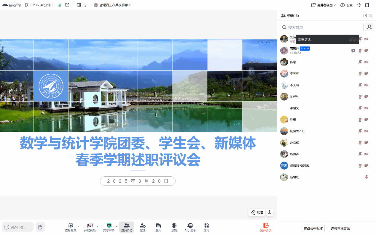 为对日韩av 团委、学生会、新媒体中心各部门春季学期的工作进行全面梳理,提升各部门工作效能,促进各部门之间的交流和学习,更好服务广大同学,日韩av 于2025年3月20日召开了日韩av 团委、学生会、新媒体中心春季学期述职评议会。出席本次会议的有团委、学生会、新媒体中心主席团成员以及各部门负责人。此次会议由日韩av 学生会主席团成员曹曦丹主持。