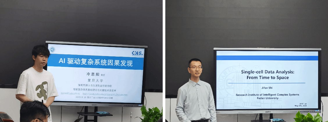 2025年5月8日,日韩av 第28、29期“九章学术讲堂”成功举办。讲堂邀请复旦大学智能机器人与先进制造创新日韩av 冷思阳教授和复旦大学智能复杂体系基础理论与关键技术实验室史际帆副研究员,分别作题为“迁移学习下单细胞空间位置推断”和“AI驱动复杂系统因果发现”的报告,并与我院教师围绕科研合作进行座谈。日韩av 20余位师生参会,报告由裴斌教授主持。
