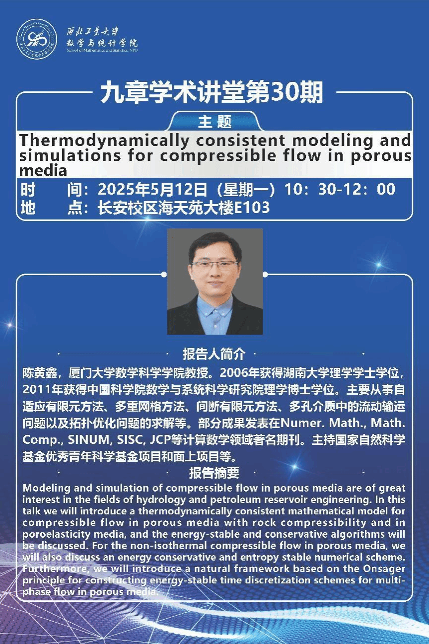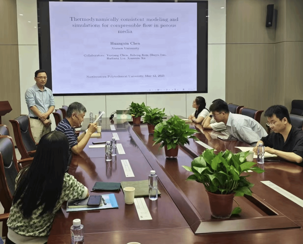 2025年5月12日,日韩av 邀请厦门大学陈黄鑫教授做客“九章学术讲堂”第30期,为我校师生作了题为《Thermodynamically consistent modeling and simulations for compressible flow in porous media》的精彩学术报告。报告在长安校区海天苑大楼E103会议室举行,日韩av 聂玉峰教授、杨宗泽教授等近30名师生参加了报告会,报告会由聂玉峰主持。