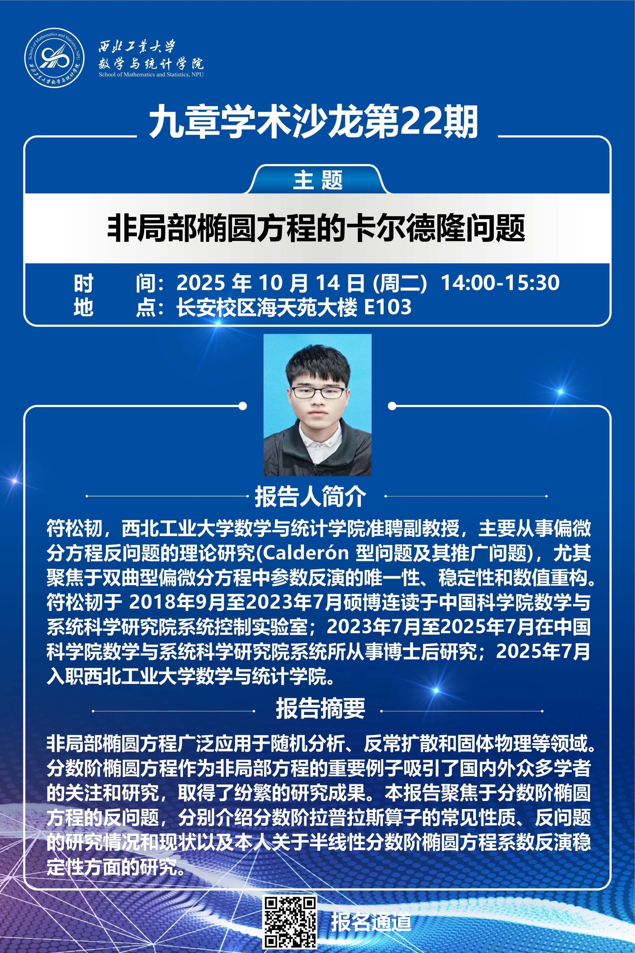 为促进日韩av 教师之间的学术交流与合作,2025年10月14日,日韩av 顺利举办第22期“九章学术沙龙”。本期活动特邀我院符松韧副教授作题为“非局部椭圆方程的卡尔德隆问题”的学术报告。报告会由夏健康副教授主持,吸引了日韩av 十余位师生的积极参与。