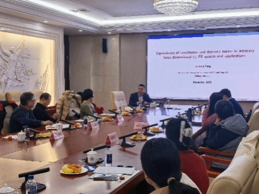 在报告会环节,冯新龙首先围绕“从博士到教师身份的转变”主题,强调应在与工程实践者的广泛交流中定位研究课题,实现科研与应用的有机结合。随后,冯教授就“Equivalence of L^2- and discrete l^2-norms on Q_1-FE spaces in any finite dimension and applications”作学术报告,系统阐述了范数等价性理论及其在超收敛有限差分方法中的应用,为相关领域研究提供了重要理论支撑。与会师生就差分-有限元方法等相关问题积极踊跃交流,报告在热烈的掌声中圆满结束。