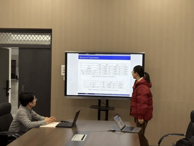 肖贵云副教授以“稀疏最小二乘问题和稀疏矩阵分解问题的数值算法”为题作报告,重点介绍了其在概率单纯形约束稀疏最小二乘、概率单纯形约束稀疏非负矩阵分解等问题上的研究进展。报告提出通过将约束优化问题转化为单位球面约束的新模型,设计几何邻近梯度算法,并给出了非凸子问题全局最优解的显式表达式。同时,针对稀疏非负矩阵分解问题提出列更新算法并设计带比例的邻近梯度算法。报告结束后,王俊刚教授围绕算法关键创新点与肖贵云副教授进行了深入交流,重点探讨了稀疏非负矩阵分解中近似全局最优解的提出思路,以及几何邻近梯度算法中非凸非光滑子问题可获得全局最优解显式表达式的理论依据与推导过程,现场讨论气氛热烈。