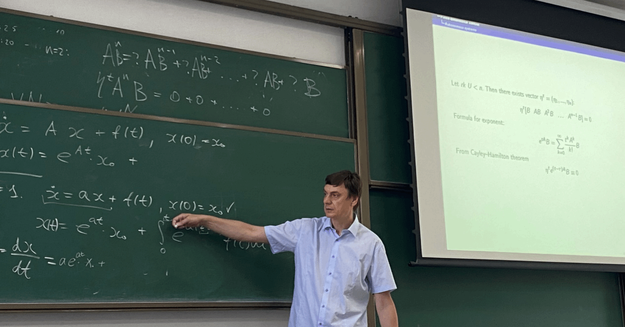 Alexey Gorshkov副教授首先回顾了有限维微分动力系统中的基本结论,从线性问题的通解出发,给出了有限维非线性系统的一般形式解。进一步的,以线性控制方法为例,引入了状态空间上的可控性概念的数学定义及其对应的直觉图像。通过定义指数稳定条件,将数学上的极限行为,转化为了可以被有限精度观测量表示的,有限时间内的稳定控制问题。借助Hamilton-Cayley定理实现高指数矩阵的低指数表示,构造了一组有限维空间中的完备基函数,通过严格的数学证明,给出了可控条件与控制函数的构建方法。